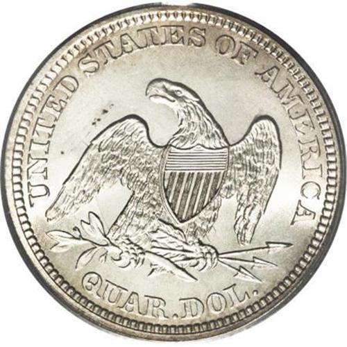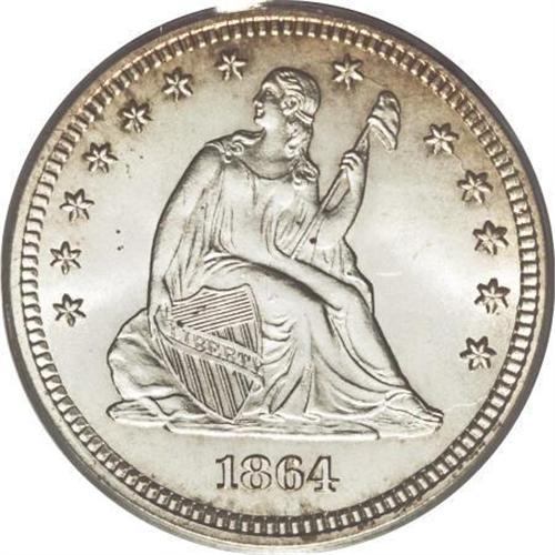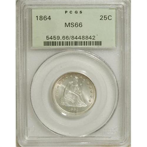 <B>1864 25C MS66 PCGS.</B></I> A low-mintage issue, but one that is generally well struck. The present piece is fully struck, with untoned, frosty silver surfaces and flashy luster. A couple of small die lumps appear on Liberty's upper thigh, and a small die crack connects the bases of DOL. Certified in a green-label holder. Splendid, and rare in Mint State. Population: 3 in 66, 3 finer (3/08).<BR><BR><B>Coin Engraver:</B> Christian Gobrecht<BR><BR><b>Shipping:</b> Coins & Currency (<a target="_blank" href="http://www.heritageauctions.com/common/shipping.php">view shipping information</a>)