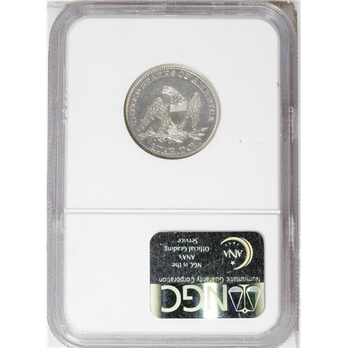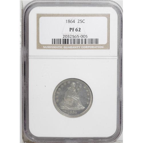 <B>1864<25C> PR62 NGC.</B></I> Rich pearl-gray toning overlays this intricately struck representative. The eagle is frosted, although the Seated Liberty exhibits only slight contrast with the mildly mirrored field. A tiny spot is noted near the D in UNITED. Just 470 proofs were coined.