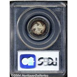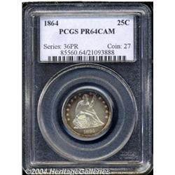 <B>1864<25C> PR64 Cameo PCGS.</B></I> An exceptional proof from the Civil War era, this glowing example displays a sharp cameo contrast that is further accented by a crescent of toning near the upper obverse rim. The reverse is even more spectacular, the richly frosted devices being fully framed by concentric circles of russet, magenta, and aquamarine toning. A coin of considerable eye appeal that is sure to please even the most discriminating collector. One of only 470 proofs coined this year. Population: 4 in 64, 1 finer (3/04).<BR><I>From the JFS Collection.</B></I> <BR><BR><B>Important notice:</B> Heritage usually auctions material at the rate of 200-250 lots per hour. On some occasions eBay Live bid software or the Internet may not be able to keep up with the pace of the auction. We recommend placing a realistic absentee bid now as insurance to avoid disappointment. Occasionally the auctioneer may eliminate or reject an eBay Live bid, and the auctioneer may also reopen a lot after the close of the eBay live bidding (usually because we missed an audience bid), and may reject your bid even if it shows you as the winning bidder. By bidding via eBay Live, you agree that Heritage may award the lot to another bidder at its sole discretion under the circumstances described above or any other reasonable circumstances. Since eBay bids are not shown to us until we open the lot on the floor, we treat those bids just like floor bids. In most cases the floor responds before the eBay bid is presented to us, due to Internet lag time, so for consistency we have made it a policy that floor bids are always considered first over tie eBay live bids. Also please note that all Heritage lots purchased through eBay Live carry a 20% Buyer's Premium. Please make sure you read the Terms and Conditions before you bid. </span></font></tr></table></td></tr></table>
