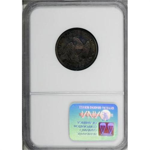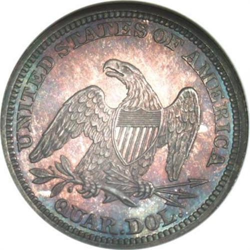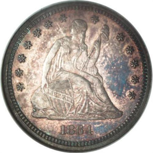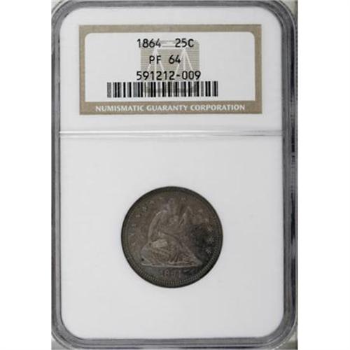 <B>1864 25C PR64 NGC.</B></I> This is a deeply patinated coin, easily determinable as a proof by its pinpoint strike detail and wire rims. The fields display underlying reflectivity, along with a dazzling array of purple and blue color, when turned just so under a light. A few trivial pinpricks appear to be the only thing preventing a Gem grade.<BR><BR><B>Coin Engraver:</B> Christian Gobrecht<BR><BR><b>Shipping:</b> Coins & Currency (<a target="_blank" href="http://www.heritageauctions.com/common/shipping.php">view shipping information</a>)