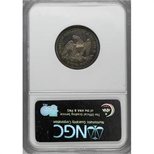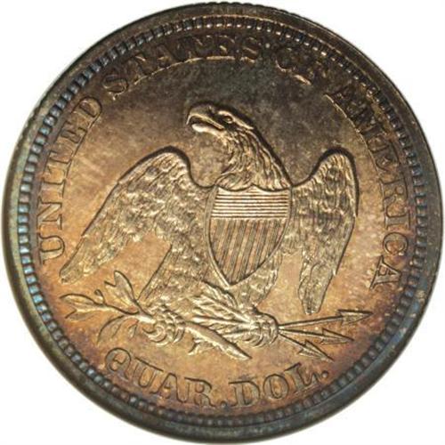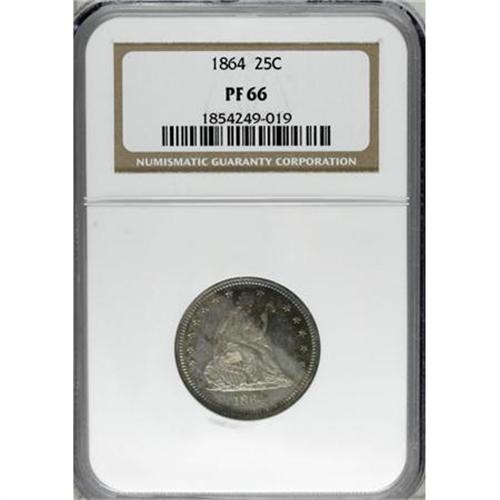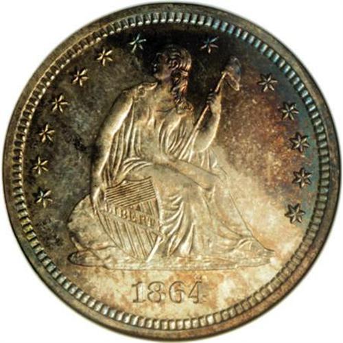 <B>1864 25C PR66 NGC.</B></I> Philadelphia struck just 470 proof quarters in 1864, but that level was an increase from the year before, and production would continue to rise as the United States emerged from the Civil War. This flashy, sharply struck specimen has dramatic patina, with aqua and cloud-gray toning over most of the obverse giving way to vibrant ruby and cerulean at the upper right. The reverse exhibits vivid sun-gold and orange patina as well. Census: 8 in 66, 5 finer (6/07).<BR><BR><B>Coin Engraver:</B> Christian Gobrecht<BR><BR><b>Shipping:</b> Coins & Currency (<a target="_blank" href="http://www.heritageauctions.com/common/shipping.php">view shipping information</a>\)
