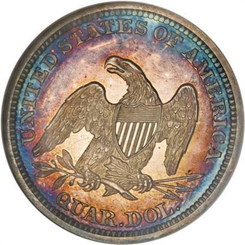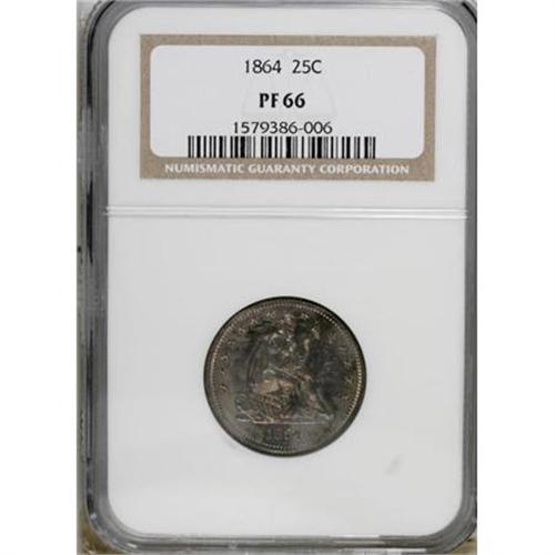 <B>1864 25C PR66 NGC.</B></I> Excellent visual appeal for this low-mintage Civil War proof issue, which has a mintage of only 470 piece. The strike is crisp, and the patina, though thick at the peripheries, thins at the centers and reveals pleasing mirrors. Powder-blue toning at the margins yields to rose-orange and translucent champagne at the central devices. Census: 9 in 66, 5 finer (12/07).<BR><BR><B>Coin Engraver:</B> Christian Gobrecht<BR><BR><b>Shipping:</b> Coins & Currency (<a target="_blank" href="http://www.heritageauctions.com/common/shipping.php">view shipping information</a>)