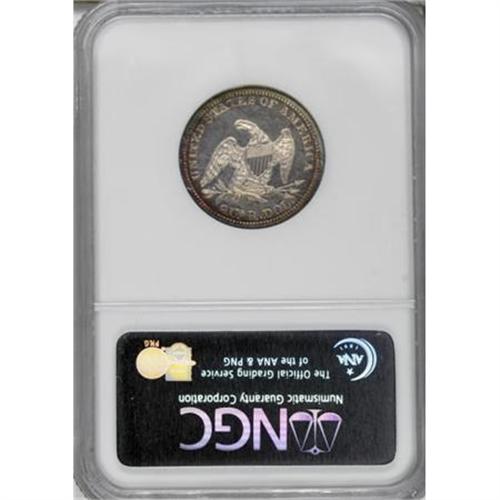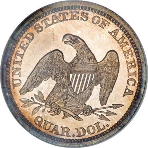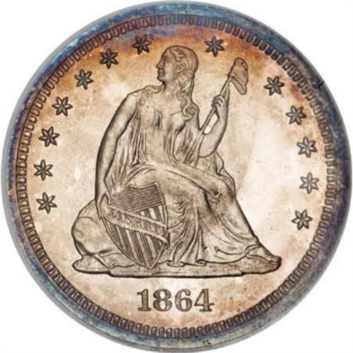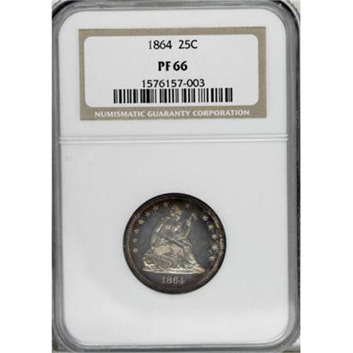 <B>1864 25C PR66 NGC.</B></I> Although not designated as such, this is a lovely cameo proof with light ivory color at the centers, framed by deeper russet, lilac, and blue at the borders. Few finer examples of the date have been certified. In fact, the No Motto design type is seldom encountered in grades finer than this piece. Census: 9 in 66, 5 finer (1/08).<BR><BR><B>Coin Engraver:</B> Christian Gobrecht<BR><BR><b>Shipping:</b> Coins & Currency (<a target="_blank" href="http://www.heritageauctions.com/common/shipping.php">view shipping information</a>)