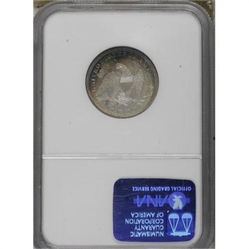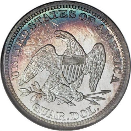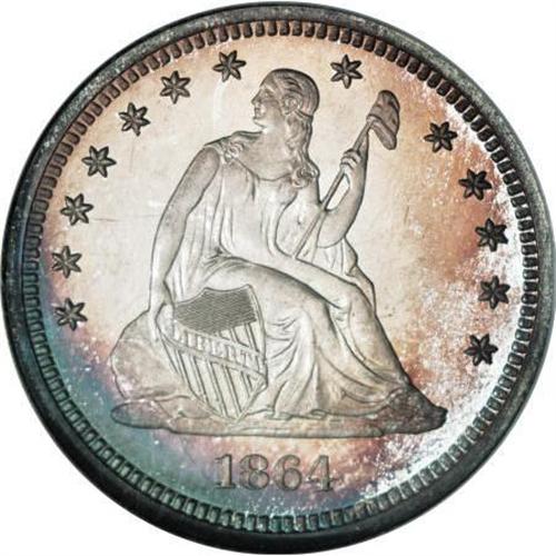 <B>1864 25C PR68 NGC.</B></I> Tied for the finest certified 1864 proof quarter, this amazing piece is a must for the advanced specialist in Seated Liberty quarters or 19th century proof coins. Only 470 of these proofs were coined, and few of those survive in Gem grades.<BR> Most of the obverse exhibits light gold toning and much of the reverse is brilliant white, each side with crescent of lilac, blue, and green. The obverse and reverse devices are boldly rendered with a light coat of mint frost that imparts an enticing cameo appearance over the mirrored fields. Census: 3 in 68, 0 finer (1/08).<BR><BR><B>Coin Engraver:</B> Christian Gobrecht<BR><BR><b>Shipping:</b> Coins & Currency (<a target="_blank" href="http://www.heritageauctions.com/common/shipping.php">view shipping information</a>)