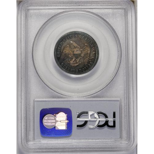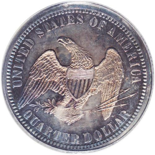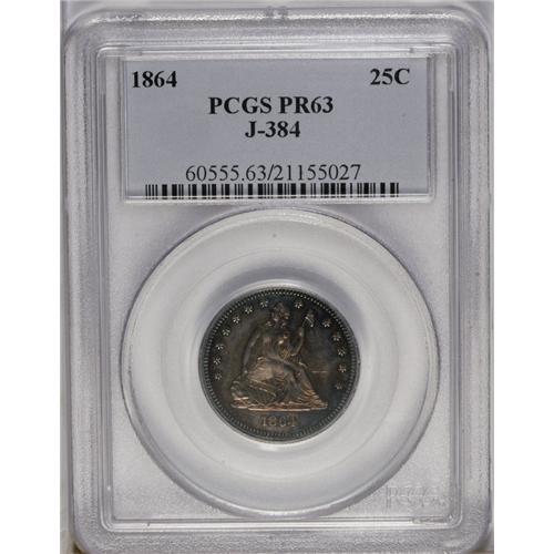 <B>1864<25C> Quarter Dollar, Judd-384, Pollock-452, Low R.7, PR63 PCGS.</B></I> Regular dies obverse and a reverse that depicts a perched eagle with outstretched wings holding an olive sprig and three long, slender arrows in its claws, as designed by Anthony Paquet. Struck in silver with a reeded edge. Both sides are layered in intermingled blue, violet, and orange-gold iridescence. A thin scratch is noted in the right obverse field between Liberty's knee and star 12.