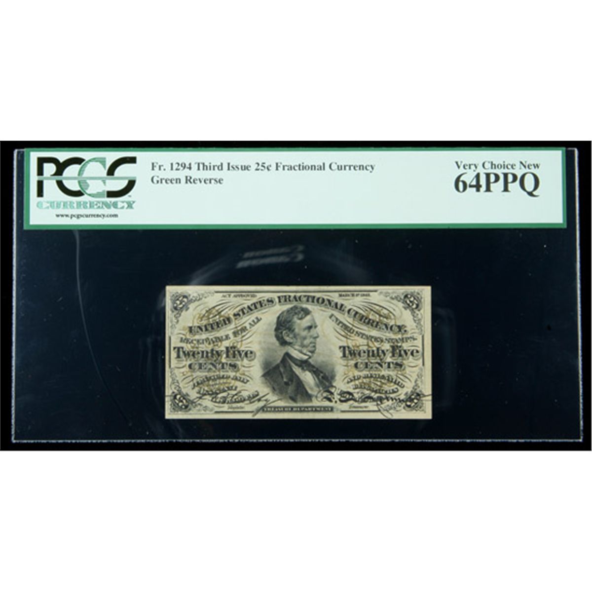 1864, 25¢ Fractional Currency. Third Issue, green reverse. PCGS Very Choice New 64PPQ. . Fr-1294. Although the centering isn't perfect, the paper quality is unquestionable and the eye appeal is well above average on this near-Gem Fessenden.