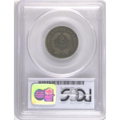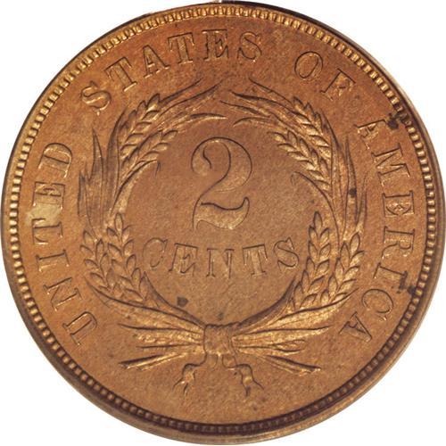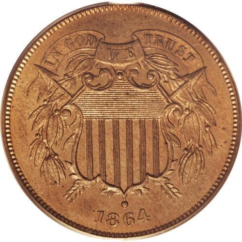 <B>1864<2C> Two Cents, Judd-371, Pollock-440, Low R.6, PR65 PCGS.</B></I> Ex: Benson. Struck from the regular coinage dies with Large Motto in copper-nickel composition with a plain edge. Splendid tan appearance with excellent eye appeal. Moderately reflective fields with sharp design features. Both the obverse and the reverse are exceptional aside from a few minor reverse spots. Related examples of this pattern were struck in nickel and aluminum composition.<BR><I>Ex: Ira S. Reed, 4/45, lot 453, which realized $12.50; Benson Collection, Part Three (Ira & Larry Goldberg, 2/03), lot 1799.</B></I><BR><I>From The Antigo Collection.</B></I>