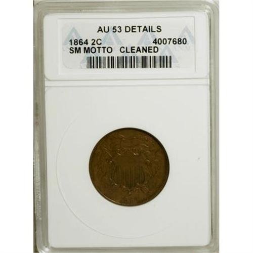 <B>1864 2C Small Motto--Cleaned--ANACS. AU53 Details.</B></I> NGC Census: (5/1129). PCGS Population (8/719). Mintage: 19,847,500. Numismedia Wsl. Price for NGC/PCGS coin in AU53: $60. <BR><BR><B>Coin Engraver:</B> James B. Longacre<BR><BR><b>Shipping:</b> Coins & Currency (<a target="_blank" href="http://www.heritageauctions.com/common/shipping.php">view shipping information</a>)