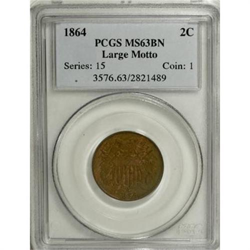 <B>1864 2C Large Motto MS63 Brown PCGS.</B></I> PCGS Population (236/228). NGC Census: (266/624). Mintage: 19,847,500. Numismedia Wsl. Price for NGC/PCGS coin in MS63: $142. (#3576)<BR><BR><B>Coin Engraver:</B> James B. Longacre<BR><BR><b>Shipping:</b> Coins & Currency (<a target="_blank" href="http://www.heritageauctions.com/common/shipping.php">view shipping information</a>)