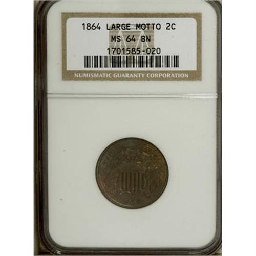 <B>1864 2C Large Motto MS64 Brown NGC.</B></I> NGC Census: (376/248). PCGS Population (185/36). Mintage: 19,847,500. Numismedia Wsl. Price for NGC/PCGS coin in MS64: $208. (#3576)<BR><BR><B>Coin Engraver:</B> James B. Longacre<BR><BR><b>Shipping:</b> Coins & Currency (<a target="_blank" href="http://www.heritageauctions.com/common/shipping.php">view shipping information</a>)