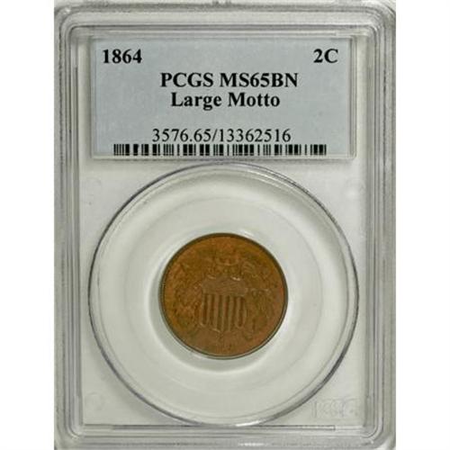 <B>1864 2C Large Motto MS65 Brown PCGS.</B></I> PCGS Population (38/2). NGC Census: (218/31). Mintage: 19,847,500. Numismedia Wsl. Price for NGC/PCGS coin in MS65: $340. (#3576)<BR><BR><B>Coin Engraver:</B> James B. Longacre<BR><BR><b>Shipping:</b> Coins & Currency (<a target="_blank" href="http://www.heritageauctions.com/common/shipping.php">view shipping information</a>)