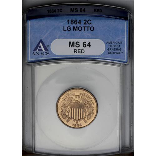 <B>1864<2C> Large Motto MS64 Red ANACS.</B></I> Original luster and color permeates the obverse, making all the details stand out. A few small abrasions in the left obverse field limit the grade.<BR><I>From The Redfjord Collection.</B></I>