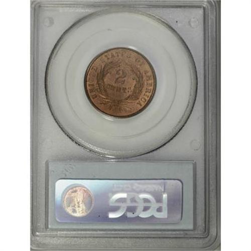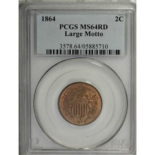 <B>1864 2C Large Motto MS64 Red PCGS.</B></I> Essentially unturned copper-orange surfaces host well struck devices on this pleasing Choice coin. Minor, scattered marks appear on each side, but no overt abrasions appear anywhere on this attractive type piece.<BR><BR><B>Coin Engraver:</B> James B. Longacre<BR><BR><b>Shipping:</b> Coins & Currency (<a target="_blank" href="http://www.heritageauctions.com/common/shipping.php">view shipping information</a>)