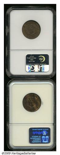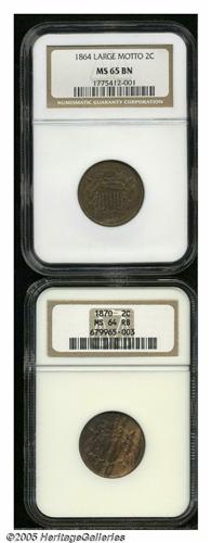 <B>1864<2C> Large Motto MS65 Brown NGC,</B></I> chocolate-brown fields, substantial mint Red in selected areas; and an <B>1870 MS64 Red and Brown NGC,</B></I> streaky honey-gold and aqua-lilac color, well struck, a few ticks on the reverse.