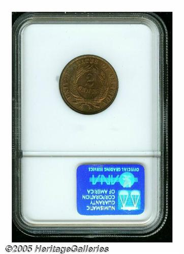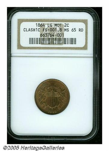 <B>1864<2C> Large Motto MS65 Red NGC.</B></I> FS-001.8. The reverse die clashed with an Indian Cent obverse die. The profile of Liberty faces east and is located near the S in CENTS. Multi-denomination die clashes are very rare; most of these are found on 1857 coinage. An unmarked honey-gold Gem, surely among the finest known pieces of the variety. Well struck in the centers and on the right sides, while the left border received a softer impression from the dies. NGC FS-001.8 Population: 1 in 65 Red, 1 finer (6/05).