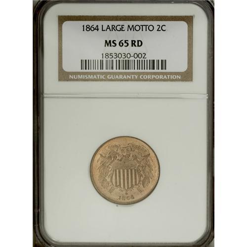 <B>1864 2C Large Motto MS65 Red NGC.</B></I> Suitably struck with vibrant, original copper-orange surfaces. A small, isolated carbon spot is noted on the upper shield.<BR><BR><b>Shipping:</b> Coin/Currency (<a target="_blank" href="http://www.heritageauctions.com/common/shipping.php">view shipping information</a>)