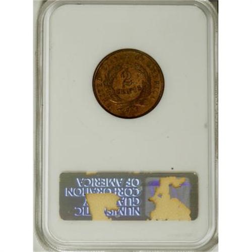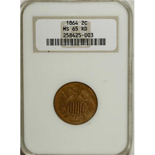 <B>1864 2C Large Motto MS65 Red NGC.</B></I> This inviting Gem offers warm pumpkin-orange surfaces with reddish accents. A solidly struck first-year example of this odd-denomination series that shows minimal carbon overall.<BR><BR><B>Coin Engraver:</B> James B. Longacre<BR><BR><b>Shipping:</b> Coins & Currency (<a target="_blank" href="http://www.heritageauctions.com/common/shipping.php">view shipping information</a>)