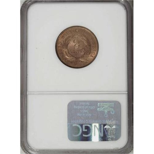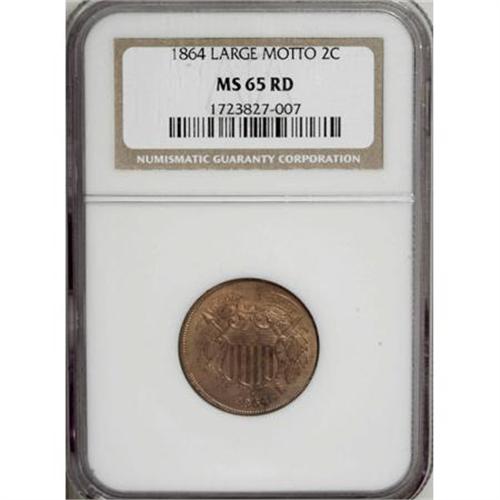 <B>1864 2C Large Motto MS65 Red NGC.</B></I> A trace of pale lilac patina visits the centers of this uniformly sharp first-year Gem. The surfaces are rich copper-orange elsewhere, and the overall preservation is sublime. A wonderful choice for the type collector.<BR><BR><B>Coin Engraver:</B> James B. Longacre<BR><BR><b>Shipping:</b> Coins & Currency (<a target="_blank" href="http://www.heritageauctions.com/common/shipping.php">view shipping information</a>)