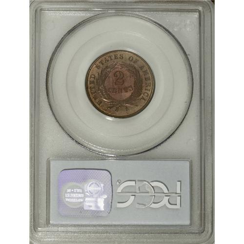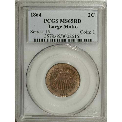 <B>1864 2C Large Motto MS65 Red PCGS.</B></I> Rose-tinged centers are framed by yellow-gold borders. Nicely struck and fully lustrous with only minor indications of contact and carbon. The two cent piece was the first denomination to carry the motto IN GOD WE TRUST.<BR><BR><b>Shipping:</b> Coins & Currency (<a target="_blank" href="http://www.heritageauctions.com/common/shipping.php">view shipping information</a>)
