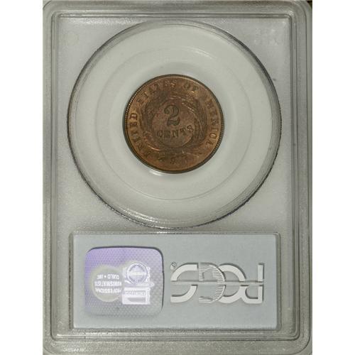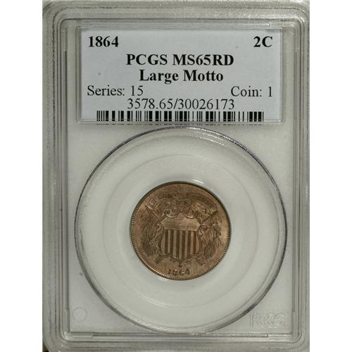 <B>1864 2C Large Motto MS65 Red PCGS.</B></I> The blushes of fire-red are particularly intense on the reverse. Hints of dusky lilac are noted within the wreath. A decisive strike and an unblemished appearance confirms the lofty grade.<BR><BR><b>Shipping:</b> Coins & Currency (<a target="_blank" href="http://www.heritageauctions.com/common/shipping.php">view shipping information</a>)