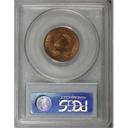 <B>1864 2C Large Motto MS65 Red PCGS. CAC.</B></I> A vibrant copper-orange representative of this popular odd-denomination type issue, pleasingly detailed with excellent eye appeal. The overall surface quality is wonderful for this Gem. PCGS has graded 47 finer pieces (12/07).<BR><BR><B>Coin Engraver:</B> James B. Longacre<BR><BR><b>Shipping:</b> Coins & Currency (<a target="_blank" href="http://www.heritageauctions.com/common/shipping.php">view shipping information</a>)