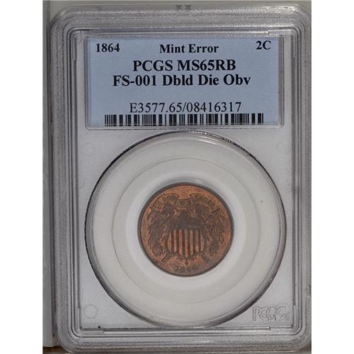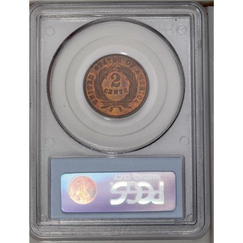 <B>1864<2C> Large Motto MS65 Red and Brown PCGS.</B></I> FS-001. Prominent doubling on the banner identifies this variety. The surfaces of this Gem are orange-copper that mellows to mahogany in areas.