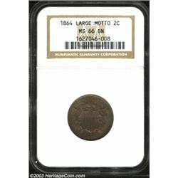 1864 2C Large Motto MS66 Brown NGC. Glossy and exquisitely preserved, with appreciable remnants of mint color clinging to the peripheral devices. Important notice: We expect to be auctioning lots at the rate of 200-250 per hour. On occasion eBay live bid software cannot keep up with the pace of the auctions where 4-5 lots per minute can hammer down, so we recommend that you place a realistic absentee bid now as insurance to avoid disappointment. Also please note that all Heritage/CAA lots purchased through eBay Live carry a 20% Buyer's Premium. Please make sure you read the Terms and Conditions.