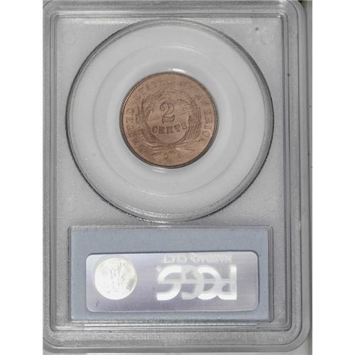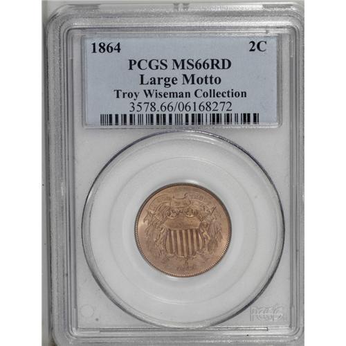 <B>1864<2C> Large Motto MS66 Red PCGS.</B></I> Fully brilliant red surfaces with exceptional aesthetic appeal. Each side has a few tiny abrasions and the obverse has a few additional microscopic spots, but none that are out of character for the grade. Population: 46 in 66 Red, 1 finer (8/06).<BR><I>From The Troy Wiseman Collection.</B></I>