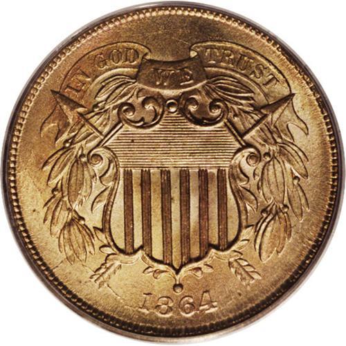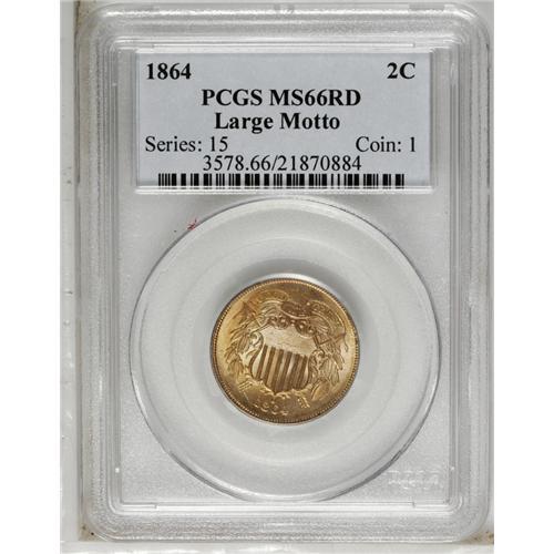 <B>1864<2C> Large Motto MS66 Red PCGS.</B></I> Perhaps it was the novelty of a two cent coin that led to so many 1864 pieces being set aside. Nevertheless, it is still surprising that so many have survived today with intact mint red color, given how many non-numismatic people must have put these coins away. This piece has blazing mint luster that is orange-red in the center with subtly deeper, cherry-red margins. Sharply defined throughout, there are numerous spindly die cracks around the peripheries and only one mark of note, to the right of the 2 on the reverse. Population: 46 in 66, 1 finer (7/06).