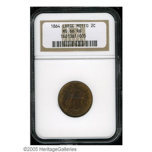 1864 2C Large Motto MS66 Red and Brown NGC. Rich a 1864[2C] Large Motto MS66 Red and Brown NGC.