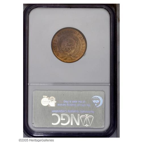 <B>1864<2C> Large Motto MS67 Red and Brown NGC.</B></I> Breen-2373, Repunched 18. Well struck with extremely vibrant luster illuminating peach-gold and lilac-red coloration on both sides. Contact-free with a curious indentation (as struck) evident at the rim near 2 o'clock on the reverse. Very scarce at this lofty grade level, with none finer in Red and Brown, at either service. Population: 3 in 67, 0 finer (10/05).