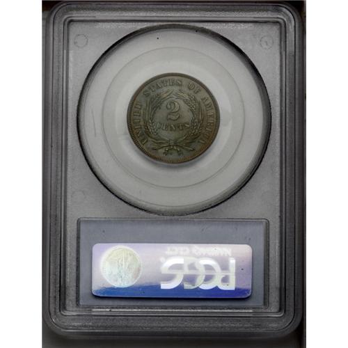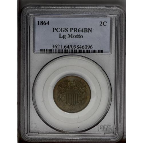 <B>1864<2C> Large Motto PR64 Brown PCGS.</B></I> A sharply struck proof with attractive olive-brown color on both sides. The reverse has pale blue toning highlights. This is an important opportunity for the advanced collector. Proof examples of this date are quite elusive. <BR><BR><B>Important notice:</B> Heritage usually auctions material at the rate of 200-250 lots per hour. On some occasions eBay Live bid software or the Internet may not be able to keep up with the pace of the auction. We recommend placing a realistic absentee bid now as insurance to avoid disappointment. Occasionally the auctioneer may eliminate or reject an eBay Live bid, and the auctioneer may also reopen a lot after the close of the eBay live bidding (usually because we missed an audience bid), and may reject your bid even if it shows you as the winning bidder. By bidding via eBay Live, you agree that Heritage may award the lot to another bidder at its sole discretion under the circumstances described above or any other reasonable circumstances. Since eBay bids are not shown to us until we open the lot on the floor, we treat those bids just like floor bids. In most cases the floor responds before the eBay bid is presented to us, due to Internet lag time, so for consistency we have made it a policy that floor bids are always considered first over tie eBay live bids. Also please note that all Heritage lots purchased through eBay Live carry a 20% Buyer's Premium. Please make sure you read the Terms and Conditions before you bid. This lot is being auctioned in conjunction with a live floor auction by Heritage Galleries & Auctioneers. All final auction and invoice information will be supplied by Heritage Galleries & Auctioneers, and all other information should be considered preliminary. Lot:740 <BR><BR><B>Winning Notification and Billing:</B> After the FINAL session in this auction is complete, Heritage will send e-mail and snail mail invoices. This process normally takes several days. All final auction and invoice information will be supplied by Heritage Galleries & Auctioneers, and all other information should be considered preliminary. <BR><BR>This auction will be conducted on a live auction floor and over the Internet through eBay Live. If you choose to place an absentee bid, please take a moment to <font color='#0000ff'><u><a href='http://pages.ebay.com/liveauctions/help/before/laabsentee.html'>learn how eBay Live absentee bidding works</a></u></font><font color='#000000'>