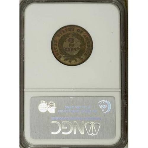 <B>1864 2C Large Motto PR65 Brown NGC.</B></I> Decisively struck with a touch of flash and distinctive coloration. The obverse has a blend of lime-green and lemon-gold patina, while the reverse displays deeper, slightly streaky pumpkin-orange and walnut-brown toning. Immensely appealing.<BR><BR><b>Shipping:</b> Coins & Currency (<a target="_blank" href="http://www.heritageauctions.com/common/shipping.php">view shipping information</a>)
