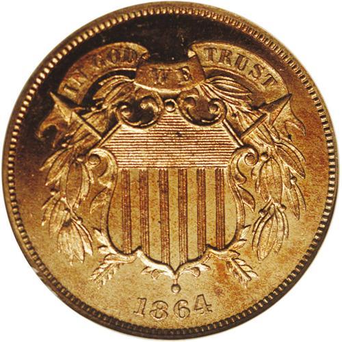 <B>1864<2C> Large Motto PR65 Cameo NGC.</B></I> A brilliant Gem example of this first year issue and a very elusive proof date. Only 100 proofs were struck of the Large Motto variety for 1864. While survivors are often found with dull surfaces, this piece has bright cherry-red color with pristine, deeply mirrored fields and crisply defined devices. There are no mentionable spots or marks visible on either side. Certainly one of the finest examples extant today. <BR><BR><B>Important notice:</B> Heritage usually auctions material at the rate of 200-250 lots per hour. On some occasions eBay Live bid software or the Internet may not be able to keep up with the pace of the auction. We recommend placing a realistic absentee bid now as insurance to avoid disappointment. Occasionally the auctioneer may eliminate or reject an eBay Live bid, and the auctioneer may also reopen a lot after the close of the eBay live bidding (usually because we missed an audience bid), and may reject your bid even if it shows you as the winning bidder. By bidding via eBay Live, you agree that Heritage may award the lot to another bidder at its sole discretion under the circumstances described above or any other reasonable circumstances. Since eBay bids are not shown to us until we open the lot on the floor, we treat those bids just like floor bids. In most cases the floor responds before the eBay bid is presented to us, due to Internet lag time, so for consistency we have made it a policy that floor bids are always considered first over tie eBay live bids. Also please note that all Heritage lots purchased through eBay Live carry a 20% Buyer's Premium. Please make sure you read the Terms and Conditions before you bid. This lot is being auctioned in conjunction with a live floor auction by Heritage Galleries & Auctioneers. All final auction and invoice information will be supplied by Heritage Galleries & Auctioneers, and all other information should be considered preliminary. Lot:742 <BR><BR><B>Winning Notification and Billing:</B> After the FINAL session in this auction is complete, Heritage will send e-mail and snail mail invoices. This process normally takes several days. All final auction and invoice information will be supplied by Heritage Galleries & Auctioneers, and all other information should be considered preliminary. <BR><BR>This auction will be conducted on a live auction floor and over the Internet through eBay Live. If you choose to place an absentee bid, please take a moment to <font color='#0000ff'><u><a href='http://pages.ebay.com/liveauctions/help/before/laabsentee.html'>learn how eBay Live absentee bidding works</a></u></font><font color='#000000'>