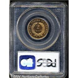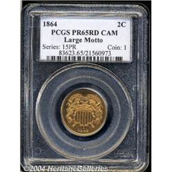 <B>1864<2C> Large Motto PR65 Red Cameo PCGS.</B></I> A Gem example of this first year issue and a very elusive proof date. Only 100 proofs were reportedly struck of the Large Motto variety for 1864. While survivors are often found with dull surfaces, this piece has bright cherry-red color with pristine, deeply mirrored fields and frosty, crisply defined devices. Certainly one of the finest examples extant today.<BR><I>Ex: Abner Kreisberg Sale (10/66), lot 2722, where it realized $208.</B></I> <BR><BR><B>Important notice:</B> Heritage usually auctions material at the rate of 200-250 lots per hour. On some occasions eBay Live bid software or the Internet may not be able to keep up with the pace of the auction. We recommend placing a realistic absentee bid now as insurance to avoid disappointment. Occasionally the auctioneer may eliminate or reject an eBay Live bid, and the auctioneer may also reopen a lot after the close of the eBay live bidding (usually because we missed an audience bid), and may reject your bid even if it shows you as the winning bidder. By bidding via eBay Live, you agree that Heritage may award the lot to another bidder at its sole discretion under the circumstances described above or any other reasonable circumstances. Since eBay bids are not shown to us until we open the lot on the floor, we treat those bids just like floor bids. In most cases the floor responds before the eBay bid is presented to us, due to Internet lag time, so for consistency we have made it a policy that floor bids are always considered first over tie eBay live bids. Also please note that all Heritage lots purchased through eBay Live carry a 20% Buyer's Premium. Please make sure you read the Terms and Conditions before you bid.