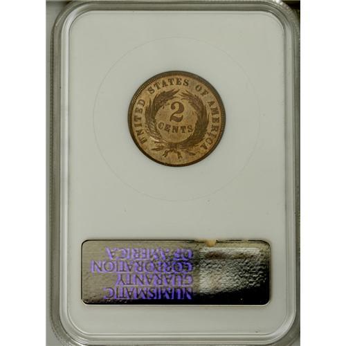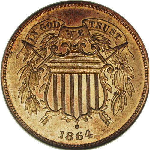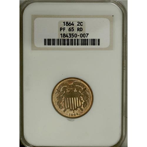 <B>1864 2C Large Motto PR65 Red NGC.</B></I> Nearly 20 million 1864 two cent pieces were struck for circulation, but proofs are rare. The <I>Guide Book</B></I> lists a proof mintage of 100+ pieces, most of which are no longer full red. A flashy orange-gold beauty with unabraded fields and pinpoint-sharp devices. Minor carbon fails to affect the eye appeal. Certified in a prior generation holder. Census: 5 in 65 Red, 4 finer (11/06).<BR><BR><b>Shipping:</b> Coin/Currency (<a target="_blank" href="http://www.heritageauctions.com/common/shipping.php">view shipping information</a>)