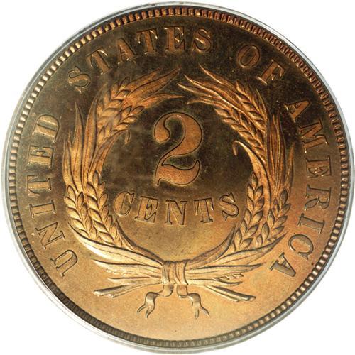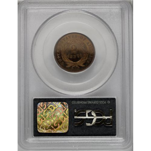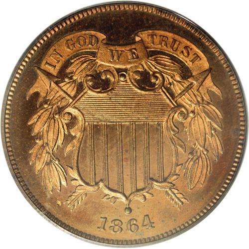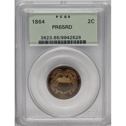 <B>1864<2C> Large Motto PR65 Red PCGS.</B></I> A glittering pumpkin-orange and pale violet specimen with the razor sharp definition anticipated of a proof. Minute carbon flecks on the lower half of the obverse can be detected under magnification, but are really not detrimental to the coin's overall appearance. The mintage of this first year proof has long been estimated at just 100 coins, a figure that may be somewhat on the low side but is nevertheless extremely small. Population: 16 in 65, 2 finer (3/06).<BR><I>From The David L. Goodwin Collection.</B></I> <BR><BR><B>Important notice:</B> Heritage usually auctions material at the rate of 200-250 lots per hour. On some occasions eBay Live bid software or the Internet may not be able to keep up with the pace of the auction. We recommend placing a realistic absentee bid now as insurance to avoid disappointment. Occasionally the auctioneer may eliminate or reject an eBay Live bid, and the auctioneer may also reopen a lot after the close of the eBay live bidding (usually because we missed an audience bid), and may reject your bid even if it shows you as the winning bidder. By bidding via eBay Live, you agree that Heritage may award the lot to another bidder at its sole discretion under the circumstances described above or any other reasonable circumstances. Since eBay bids are not shown to us until we open the lot on the floor, we treat those bids just like floor bids. In most cases the floor responds before the eBay bid is presented to us, due to Internet lag time, so for consistency we have made it a policy that floor bids are always considered first over tie eBay live bids. Also please note that all Heritage lots purchased through eBay Live carry a 20% Buyer's Premium. Please make sure you read the Terms and Conditions before you bid. This lot is being auctioned in conjunction with a live floor auction by Heritage Galleries & Auctioneers. All final auction and invoice information will be supplied by Heritage Galleries & Auctioneers, and all other information should be considered preliminary. Lot:741 <BR><BR><B>Winning Notification and Billing:</B> After the FINAL session in this auction is complete, Heritage will send e-mail and snail mail invoices. This process normally takes several days. All final auction and invoice information will be supplied by Heritage Galleries & Auctioneers, and all other information should be considered preliminary. <BR><BR>This auction will be conducted on a live auction floor and over the Internet through eBay Live. If you choose to place an absentee bid, please take a moment to <font color='#0000ff'><u><a href='http://pages.ebay.com/liveauctions/help/before/laabsentee.html'>learn how eBay Live absentee bidding works</a></u></font><font color='#000000'>