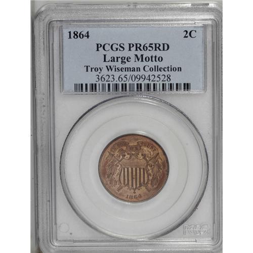 <B>1864<2C> Large Motto PR65 Red PCGS.</B></I> A glittering pumpkin-orange and pale violet specimen with the razor-sharp definition anticipated of a proof. Minute carbon flecks on the lower half of the obverse can be detected under magnification, but are really not detrimental to the coin's overall appearance. The mintage of this first-year proof has long been estimated at just 100 coins, a figure that may be somewhat on the low side but is nevertheless extremely small. Population: 16 in 65, 2 finer (7/06).<BR><I>From The Troy Wiseman Collection.</B></I>