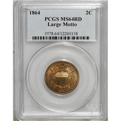 <B>1864 2C Large Motto MS64 Red PCGS.</B></I> . PCGS Population (240/257). NGC Census: (107/157). Mintage: 19,847,500. Numismedia Wsl. Price for NGC/PCGS coin in MS64: $600. (#3578)<BR><BR><B>Coin Engraver:</B> James B. Longacre<BR><BR><b>Shipping:</b> Coins & Currency (<a target="_blank" href="http://www.heritageauctions.com/common/shipping.php">view shipping information</a>)