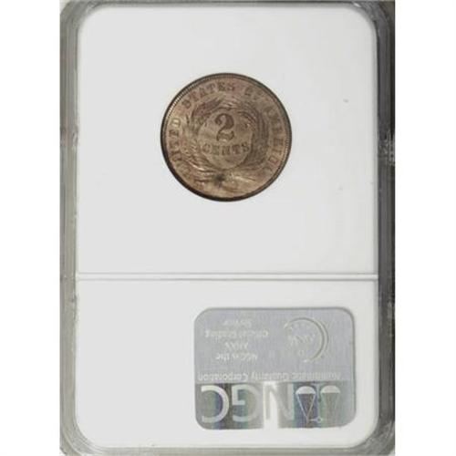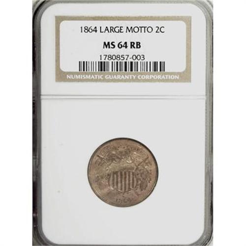 <B>1864 2C Large Motto MS64 Red and Brown NGC.</B></I> . NGC Census: (456/621). PCGS Population (793/277). Mintage: 19,847,500. Numismedia Wsl. Price for NGC/PCGS coin in MS64: $275. (#3577)<BR><BR><B>Coin Engraver:</B> James B. Longacre<BR><BR><b>Shipping:</b> Coins & Currency (<a target="_blank" href="http://www.heritageauctions.com/common/shipping.php">view shipping information</a>)