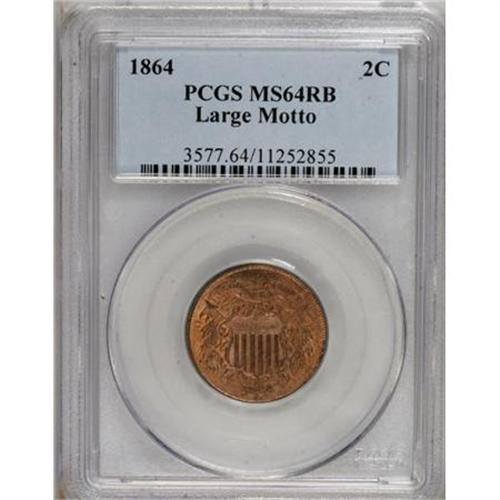 <B>1864 2C Large Motto MS64 Red and Brown PCGS.</B></I> PCGS Population (795/277). NGC Census: (448/618). Mintage: 19,847,500. Numismedia Wsl. Price for NGC/PCGS coin in MS64: $280. (#3577)<BR><BR><B>Coin Engraver:</B> James B. Longacre<BR><BR><b>Shipping:</b> Coins & Currency (<a target="_blank" href="http://www.heritageauctions.com/common/shipping.php">view shipping information</a>)