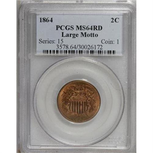 <B>1864 2C Large Motto MS65 Red and Brown NGC.</B></I> NGC Census: (524/94). PCGS Population (264/13). Mintage: 19,847,500. Numismedia Wsl. Price for NGC/PCGS coin in MS65: $480. (#3577)<BR><BR><B>Coin Engraver:</B> James B. Longacre<BR><BR><b>Shipping:</b> Coins & Currency (<a target="_blank" href="http://www.heritageauctions.com/common/shipping.php">view shipping information</a>)