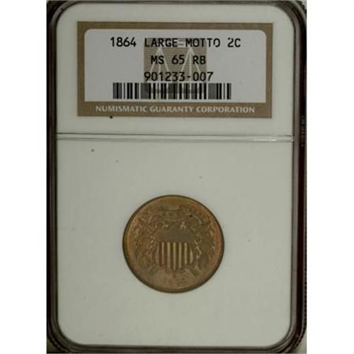 <B>1864 2C Large Motto MS65 Red and Brown NGC.</B></I> NGC Census: (527/95). PCGS Population (262/11). Mintage: 19,847,500. Numismedia Wsl. Price for NGC/PCGS coin in MS65: $500. (#3577)<BR><BR><B>Coin Engraver:</B> James B. Longacre<BR><BR><b>Shipping:</b> Coins & Currency (<a target="_blank" href="http://www.heritageauctions.com/common/shipping.php">view shipping information</a>)