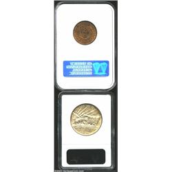1864 2C Large Motto Two Cent Piece MS64 Red and Brown NGC, the date is lightly repunched directly south, well struck and virtually unabraded with tan and gold patina; and a 1936 Oregon Half Dollar MS65 ANACS, a well struck Gem with good luster and immaculate surfaces. 2 coins Important notice: We expect to be auctioning lots at the rate of 200-250 per hour. Sometimes eBay Premier live bid software cannot keep up with that pace, so we strongly recommend that you place a realistic proxy bid now as insurance to avoid disappointment. Also please note that all Heritage/CAA lots purchased through eBay Premier carry a 20% Buyer's Premium. Please make sure you read the Terms and Conditions.