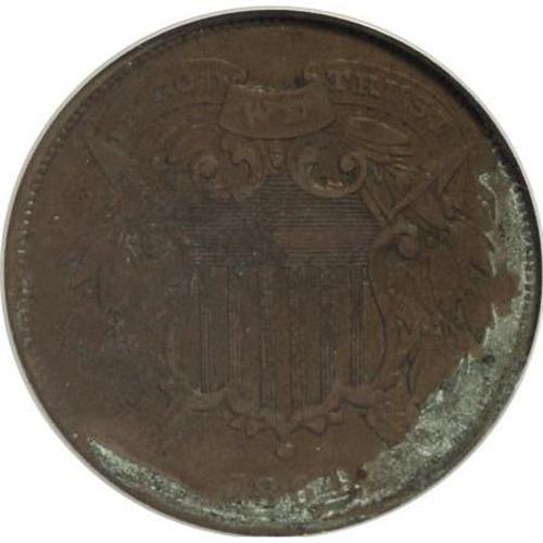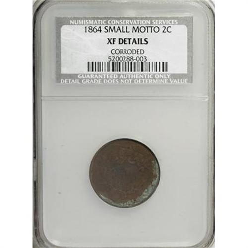 <B>1864 2C Small Motto--Corroded--NCS. XF Details.</B></I> NGC Census: (0/0). PCGS Population (0/0). Mintage: 19,847,500. (#3579)<BR><BR><B>Coin Engraver:</B> James B. Longacre<BR><BR><b>Shipping:</b> Coins & Currency (<a target="_blank" href="http://www.heritageauctions.com/common/shipping.php">view shipping information</a>)