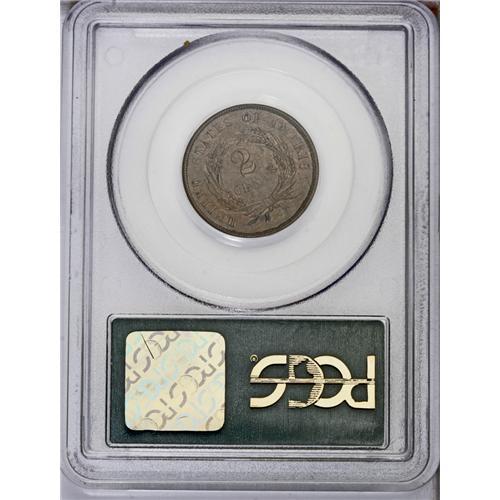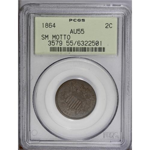 <B>1864<2C> Small Motto AU55 PCGS.</B></I> A solidly struck chocolate-brown example with minor wear. Violet overtones add to the eye appeal of this Choice AU piece. Housed in a yellow label holder.