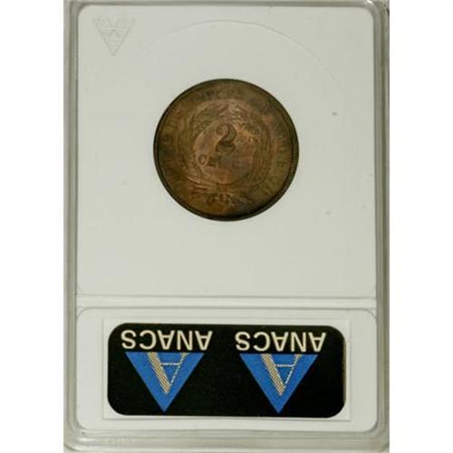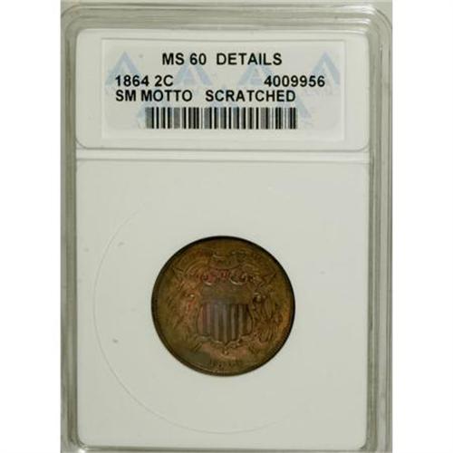 <B>1864 2C Small Motto Brown--Scratched--ANACS. MS60 Details.</B></I> NGC Census: (2/183). PCGS Population (2/91). Mintage: 19,847,500. Numismedia Wsl. Price for NGC/PCGS coin in MS60: $625. (#3579)<BR><BR><B>Coin Engraver:</B> James B. Longacre<BR><BR><b>Shipping:</b> Coins & Currency (<a target="_blank" href="http://www.heritageauctions.com/common/shipping.php">view shipping information</a>)