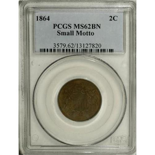 <B>1864 2C Small Motto MS62 Brown PCGS.</B></I> An attractive chocolate-brown representative of this <I>Guide Book</B></I> variant, well struck with hints of original copper-orange at the margins. Pleasing for the grade assigned.<BR><BR><B>Coin Engraver:</B> James B. Longacre<BR><BR><b>Shipping:</b> Coins & Currency (<a target="_blank" href="http://www.heritageauctions.com/common/shipping.php">view shipping information</a>)