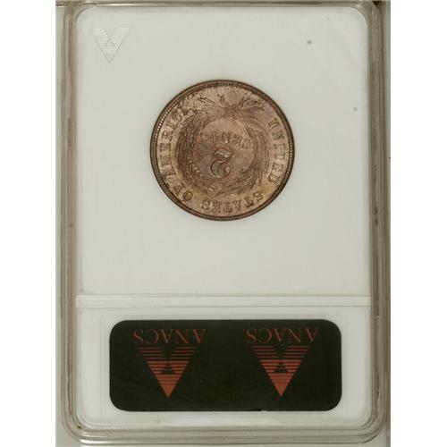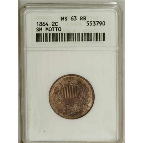 <B>1864<2C> Small Motto MS63 Red and Brown ANACS.</B></I> Mostly pink-copper colored with scattered areas of multicolored patina on both sides and extremely sharp design details. Superb for the assigned grade.