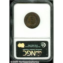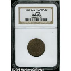 <B>1864 2C Small Motto MS64 Brown NGC.</B></I> FS-000.5. This key date shows faded red and light blue patina, is sharply struck, and devoid of significant blemishes. Population: 44 in 64, 30 finer (2/05).